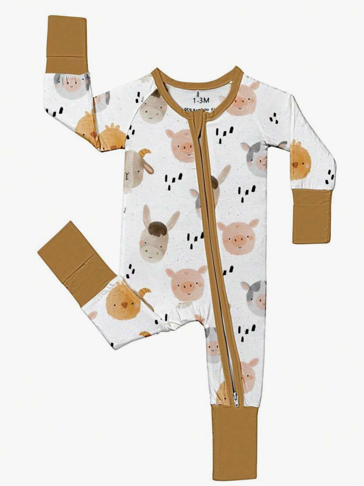 This bamboo farm animal romper sleeper features playful farm-themed graphics and a zip-up design that makes changing quick and hassle-free while keeping your little one cozy. Crafted from soft, breathable bamboo fabric, it’s gentle on sensitive skin and perfect for both lounging and restful naps.