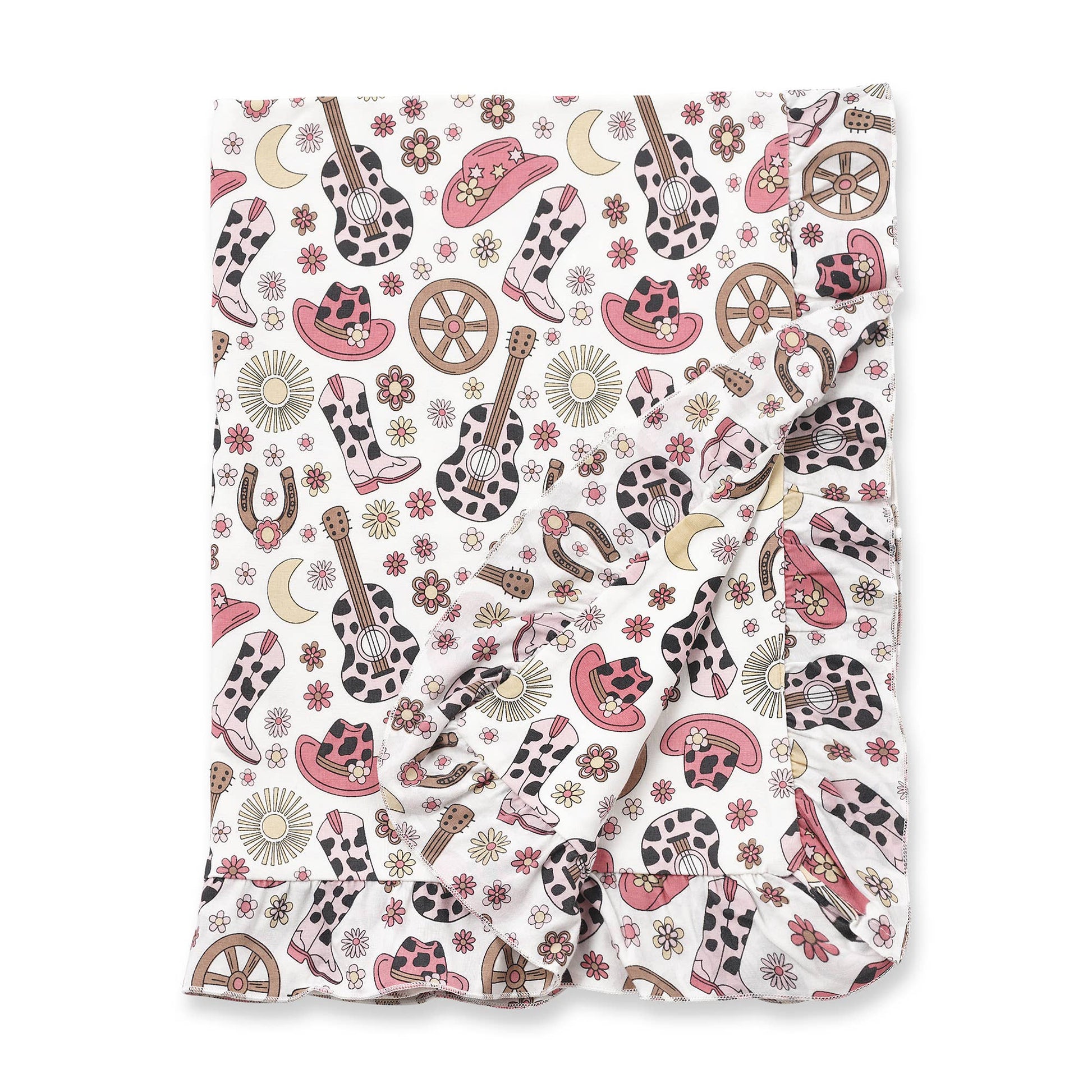 Perfect for her wild-west adventures, this Western-themed, ultra-soft stroller blanket is crafted from a blend of bamboo, cotton, and spandex jersey. Little ones will adore the absorbent, hypoallergenic, eco-friendly, and sweat-resistant material, ensuring comfort on every outing. Measuring a cozy 30" x 22", it's the perfect companion for strolls and snuggles. Machine wash warm, tumble dry low.