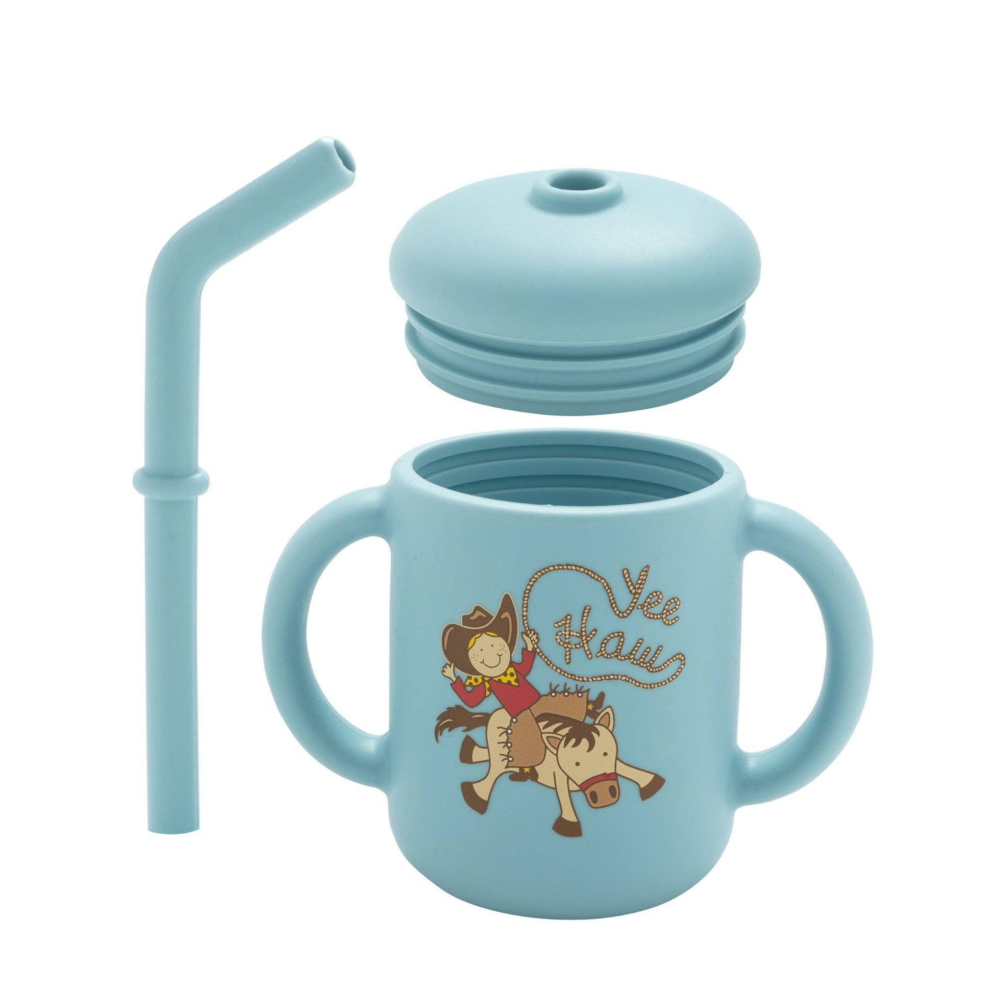 The Yee Haw Fresh & Messy Sippy Cup features a western rodeo horse and a rope that spells yee haw. The brand new 6 ounce silicone sippy includes a removable lid and straw.